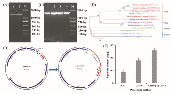 Heterologous biosynthesis of Sanghuangporus baumii triterpenoid in yeast. (A) AACT gene cloning; (B) construction of the AACT gene overexpression vector; (C) detection of positive transformants; (D) homologous alignment analysis of the AACT gene; (E) squalene content in yeast (Ck1, yeast cells transformed with pYES2-NTC; Ca150, cells transformed with pYES2-NTC treated with 150 mM Ca2+; Ca150+pYE-AACT, cells expressing the AACT gene and treated with 150 mM Ca2+). Different letters share significant difference, p < 0.05.