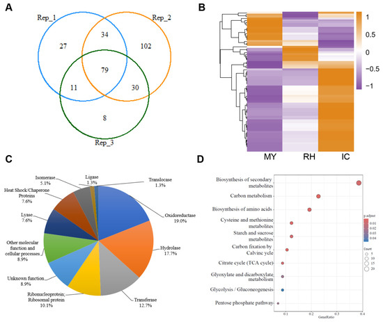 The secretory proteome in the apoplast of wheat coleoptiles during the early stage of Fusarium graminearum infection. (A) Venn diagram showing the overlap of F. graminearum secretory proteins in apoplast identified by liquid chromatography–tandem mass spectrometry (LC-MS/MS) in three biological replicates; (B) gene expression heat map of 79 overlapping secretory proteins. Expression levels were normalized in all three types, including mycelia grown in complete medium, epiphytically growing runner hyphae (RH) and plant-penetrating infection cushions (IC) on the plant surface; (C) categories of the identified secretory proteins. Secretory proteins were classified into 11 different groups based on their biological functions; (D) KEGG pathway enrichment analysis of the overlapping 79 secretory proteins of F. graminearum.