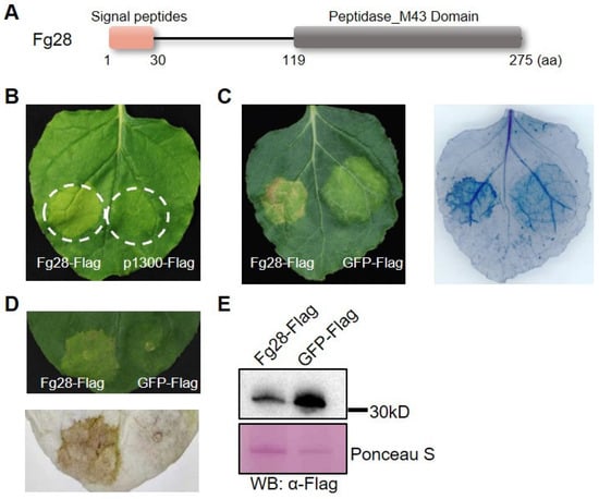 To further investigate the potential function of these secretory proteins of F. graminearum, the coding sequences of 16 proteins with secretory signal peptides were cloned and transiently expressed in N. benthamiana leaves. Green fluorescent protein (GFP) was used as a negative control. A secretory metalloprotease protein Fg28 (encoded by FGSG_00028) containing a Peptidase_M43 domain and a signal peptide was identified that induced cell death in N. benthamiana after 5 d of infiltration (Figure 2A,B). In comparison with the GFP, macroscopic cell death was observed in the zone with Fg28 expression by trypan blue staining (Figure 2C). Furthermore, DAB staining showed that Fg28 induced significant ROS accumulation compared to the GFP control (Figure 2D). The expression of Fg28 in infiltrated leaves was confirmed by Western blot (Figure 2E, Figures S2 and S3). Thus, we identified a cell-death-inducing protein of F. graminearum from the apoplast fluid of wheat coleoptiles.