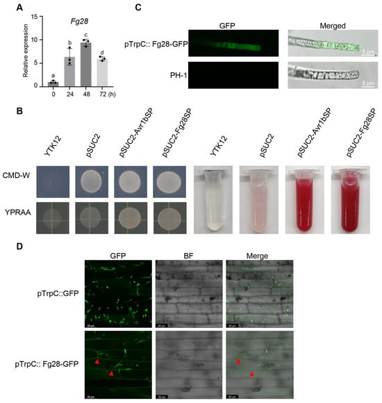 Fg28 secreted into wheat apoplast during the early stages of F. graminearum infection. (A) Relative transcript levels of Fg28 during different stages of infection in wheat. Significant differences are indicated by different letters; (B) functional validation of the Fg28 signal peptides using yeast invertase secretion assay. Yeast transformants were cultured on CMD-W and YPRAA plates. The enzymatic activity of the secreted invertase was detected by reduction of 2, 3, 5-triphenyltetrazolium chloride (TTC) to insoluble red-colored 1, 3, 5-triphenylformazan (TPF); (C) the subcellular localization of the Fg28 in F. graminearum hyphal cells; (D) the Fg28-GFP fluorescence was detected in wheat cells. Fluorescence was observed and measured 2 dpi in wheat coleoptiles. The triangles indicated the secretion of GFP fluorescence in wheat cells.