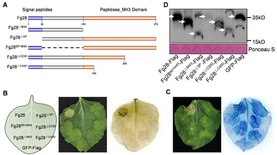 To determine which region of Fg28 is necessary for inducing the cell death, a series of mutant recombinant Flag tagged proteins of Fg28 (Fg28ΔM43, Fg28ΔSP, Fg28SP+M43, Fg28ΔC200 and Fg28ΔC400) were constructed (Figure 4A) and transiently expressed in N. benthamiana leaves. The results showed that the full length of Fg28 induced cell death, whereas all the deletion mutants lost the ability to induce cell death. ROS staining and trypan blue also confirmed this result (Figure 4B,C). Western blot analysis confirmed the expression of full-length Fg28 protein and Fg28 truncated proteins (Figure 4D and Figure S3).