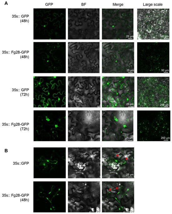 For the subcellular localization of Fg28 in N. benthamiana, the coding sequence of Fg28 was inserted into the plasmid pCAMBIA1300-GFP via the BamHI and SalI restriction sites. The constructed pCAMBIA1300-Fg28-GFP and pCAMBIA1300-GFP were introduced into Agrobacterium strain GV3101 and transiently expressed in N. benthamiana. For plasmolysis, 10% NaCl was used. The fluorescence signal of the agroinfiltrated area was observed and photographed using an SP8 confocal microscope (Leica, Wetzlar, Germany) after 48 h and 72 h of infiltration.