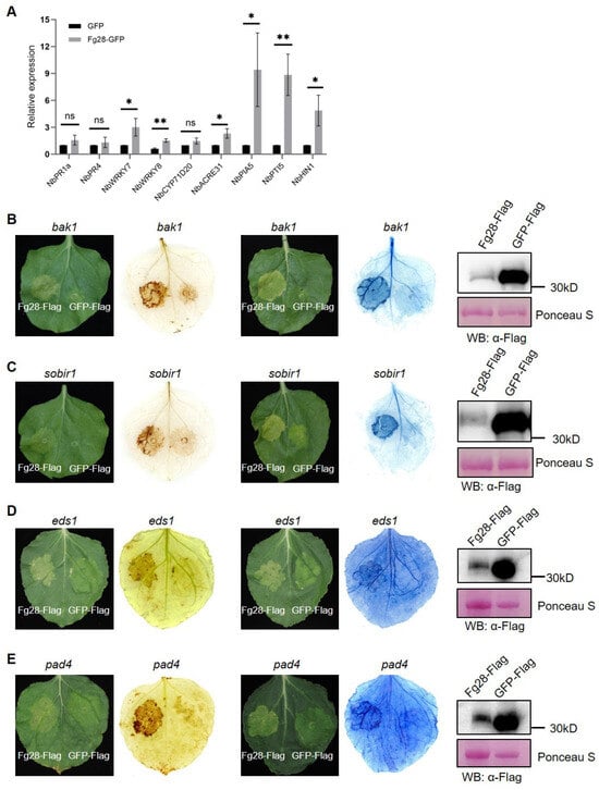 Fg28 induces immune response in N. benthamiana leaves but is independent of BAK1, SOBIR1, EDS1 and PAD4. (A) Relative transcription levels of plant defense-related genes (NbPR1 and NbPR4), PTI marker genes (NbWRKY7, NbWRKY8, NbCYP71D20, NbACRE31, NbPIA5 and NbPTI5) and a hypersensitive response gene (NbHIN1) in N. benthamiana. NbActin was used as an internal reference gene. Asterisks indicate significant differences based on multiple t test (**, p < 0.01; *, p < 0.05; ns, p > 0.05); (B–E) BAK1 (B), SOBIR1 (C), EDS1 (D) and PAD4 (E) are not required for Fg28-induced cell death in N. benthamiana. ROS was assessed by DAB staining at 5 dpi in N. benthamiana. Cell death was assessed by trypan blue staining. Fg28-Flag and GFP-Flag were detected by Western blot using the anti-Flag antibody. Ponceau staining of Rubisco was used as a loading control.
