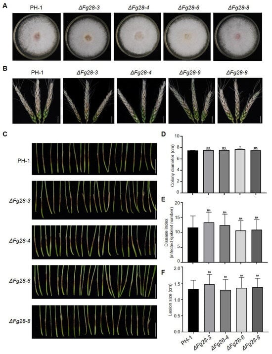 Fg28 does not affect the virulence of F. graminearum. (A,D) Colony morphology and diameter of the wild-type (PH-1) and Fg28 knockout mutant strains (ΔFg28-3, ΔFg28-4, ΔFg28-6 and ΔFg28-8) cultured on potato dextrose agar at 28 °C for 4 d. The mean and standard deviation of colony diameter were calculated from three independent experiments (*, p < 0.05; ns, p > 0.05); (B,E) the disease index of wheat heads inoculated with PH-1 or Fg28 -knockout mutant strains (ΔFg28-3, ΔFg28-4, ΔFg28-6 and ΔFg28-8). The mean and SD were obtained from three independent replicates, each containing at least 20 spikes. Asterisks indicate a significant difference based on unpaired two-tailed Student’s t-test (*, p < 0.05; ns, p > 0.05). Scale bars, 1 cm. (C,F) Lesion sizes on wheat coleoptiles inoculated with PH-1 or Fg28 knockout (ΔFg28-3, ΔFg28-4, ΔFg28-6 and ΔFg28-8) mutant strains. Mean lesion sizes were calculated from three independent replicates, each containing at least 15 seedlings. Asterisks indicate a significant difference based on unpaired two-tailed Student’s t-test (*, p < 0.05; ns, p > 0.05). Scale bars, 1 cm.