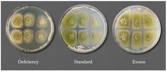 3.4.5. Specific Mold Species Spore Production Affection by D. hansenii in Modified Nutrient Concentration Conditions: Relative to Mycelial Expansion
