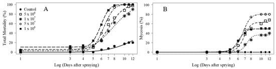 Overall (total) and confirmed mortalities (cadavers with fungal sporulation) means on different days for Euschistus heros adults treated with Metarhizium anisopliae at different concentrations. Curves were adjusted according to Logistic (A) and Brain–Cousens (B) non-linear models.
