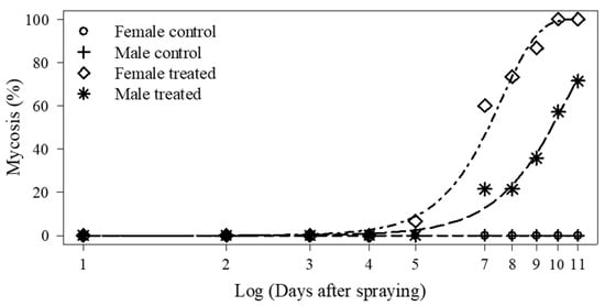 Female adult cadavers with fungal sporulation (mycosis) were significantly higher in number than those of males at 11 days after spraying (p < 0.001) (Figure 2). No infected adults were observed in the controls, and the counts differed between male and female groups (p = 0.005, p < 0.0001, respectively) (Figure 2). The LT50 was lower for females (7.1 days) than for males (9.7 days) (Table 4).