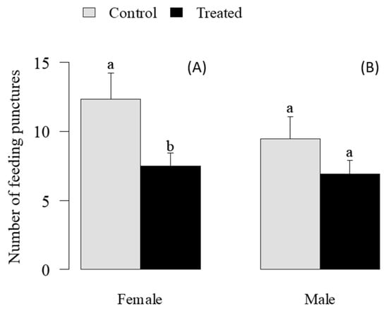 Number of feeding punctures by female (A) and male (B) adults of Euschistus heros in soybean seeds at 11 days after spraying of Metarhizium anisopliae at 1 × 10⁸ conidia mL−1. Different letters indicate significant differences (p < 0.05) by Student’s t-test.
