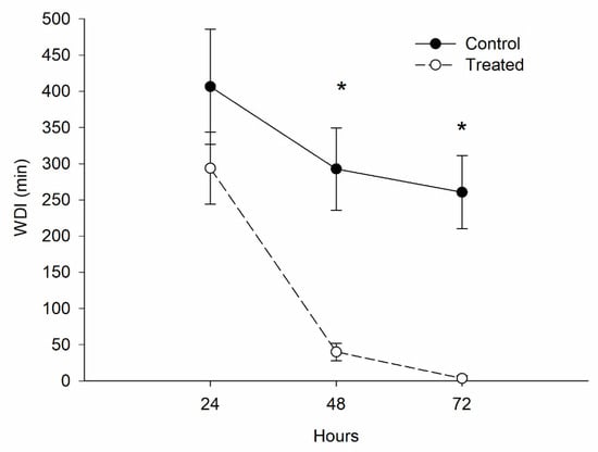 Insects treated with M. anisopliae showed a reduction in WDI in probing activities (Eh1, Eh2, Eh3a, Eh3b, Eh4 waveforms) (86%) (F = 24.43, p < 0.001) at 48 h and (98%) (F = 10.68, p < 0.001) at 72 h after recording started (Figure 4).
