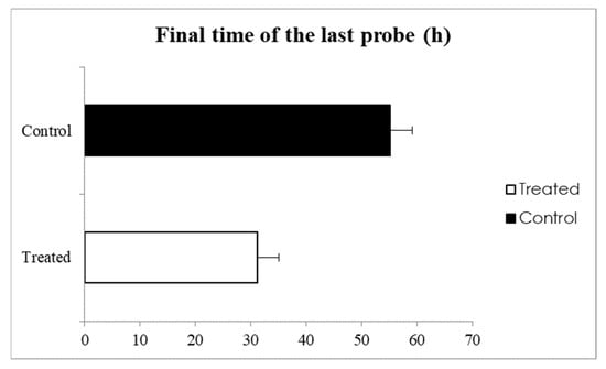The final time of the last probe (%) of Euschistus heros untreated (control) and treated with M. anisopliae feeding on soybean plants. p < 0.05 is considered different by F-test.