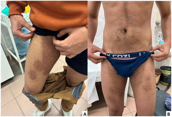 A male patient in his twenties was admitted to the Department of Dermatology and Venereology, Clinical Centre, University of Debrecen with reddish-brown fine scaly patches on both forearms and on the right thighs (Figure 1A), which were sometimes confluent. According to the patient, he did not use topical therapy and had no history of a notable disease prior. Based on the clinical picture, isoconazole-nitrate and diflurtocolone-valerate (10 mg/g and 1 mg/g, respectively) cream BID (twice daily), and fluconazole capsule (150 mg) twice weekly were recommended, and an appointment for control examination was arranged in three weeks. Mycological examination was not performed at that time. On revisit, he reported worsening symptoms with severe itching. On physical examination, on both forearms, and above the sternum, 5–10 cm large hyperaemic areas were observed, together with an area of scaly livid inflammation extending from the lower abdomen to the navel and the medial surface of the thighs and inguinal folds. Skin scraping was collected for mycological examination, and the recommended therapy was changed to daily washing with ketoconazole shampoo (20 mg/g) and application of terbinafine cream (10 mg/g) BID with a control examination in three weeks. The patient did not appear at the planned appointment, attending, however, three months later. On physical examination, lesions were almost completely healed, only post-inflammatory hyperpigmentation (Figure 1B) was observable, together with excoriated papules on the dorsal surface of the thighs. According to the patient, he was unsatisfied with the effectiveness of the prescribed regimen, and after three weeks he switched to naftifine ointment (10 mg/g) and vinegar (unknown concentration and frequency) topically as a home remedy for six weeks. He also mentioned that his sibling had similar symptoms on his visit home in India last year. Since the culture results were available at that time, and T. indotineae was confirmed with known susceptibility results, further therapy was switched to per os (itraconazole 100 mg) daily for at least four weeks. Since then, the patient has not attended any follow-ups. Written informed consent was obtained during his last visit.