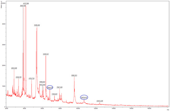 Bruker Compass (version 4.1) in Research Use Only mode identified the isolate as T. mentagrophytes complex, yet the score was below 2.00, which indicates that only genus level identification was possible with high confidence. MSI-2 identified the isolate as T. indotineae, with only B level evidence, however, which is practically similar to the level of confidence to genus-level identification by the Biotyper Compass. It should be noted that the Bruker Filamentous Fungi database does not include reference spectra for T. indotineae in the used version. On visual examination of the acquired spectra using Bruker FlexAnalyis (version 3.4), the two indicative peaks of T. indotineae at 6845 ± 5 Da and 10,680 ± 10 Da were detected (Figure 2) [16]. Based on these results, the isolate was deemed to be sequenced to confirm the MALDI-TOF MS identification results.