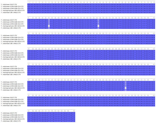 Multiple alignment of the ITS region of the isolate 26337 compared to UCMS-IGIB-CI14, UCMS-IGIB-CI12 T. indotineae strains [19], T. mentagrophytes CBS 428.63, and T. indotineae strain CBS 146623.