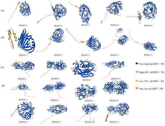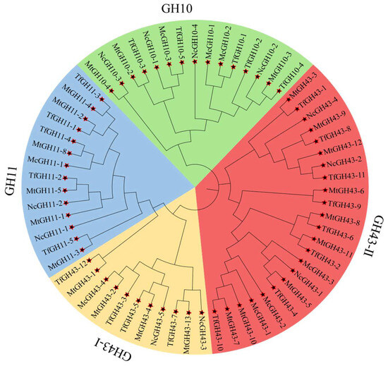 3.2. Phylogenetic Association of TfGH10, TfGH11, and TfGH43 Family Members