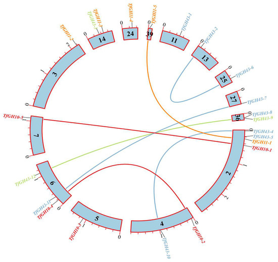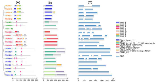 2.2. Construction of Phylogenetic Tree of TfGH10, TfGH11, and TfGH43 Gene Families