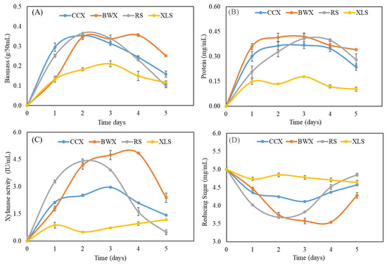 - Basotra, N.; Joshi, S.; Satyanarayana, T.; Pati, P.K.; Tsang, A.; Chadha, B.S. Expression of catalytically efficient xylanases from thermophilic fungus Malbranchea cinnamomea for synergistically enhancing hydrolysis of lignocellulosics. Int. J. Biol. Macromol. 2018, 108, 185–192. [Google Scholar]
