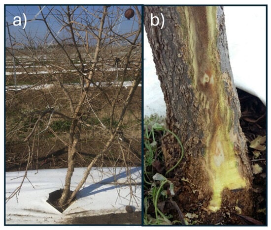 Symptomatic Plant 1 showing a large canker on the trunk (a) and subcortical browning on Plant 2 (b), both sampled for the metabarcoding analysis in Pavona (RM).