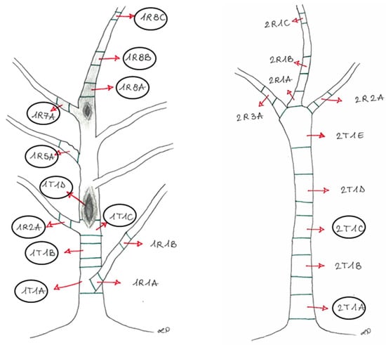 The sampling points of Plant1 (left) and Plant2 (right), showing the cankers and browning wood, with the identification legend of each sampled section, later described in Table 1. The circled sections were used for the metabarcoding analysis.