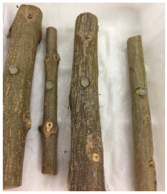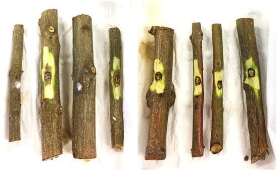 Second procedure: Detached twigs of at least four years old, placed in water, were inoculated, wounding the bark with a razor blade in a basipetal orientation and exposing the youngest wood; then, the strip of tissue was pulled back to place the PDA with the mycelium on the exposed xylem. The inoculation area was covered with a cotton disc soaked with 3 mL of sterile tap water, wrapped with tinfoil strips, and stuck with paper tape, as shown in Figure 4 []. The twigs were placed in water at 25 °C with a photoperiod of 13 h of light (13/11), and were checked weekly to change the water. After seven days, the tinfoil strips were removed. The test was completed at 90 DPI.