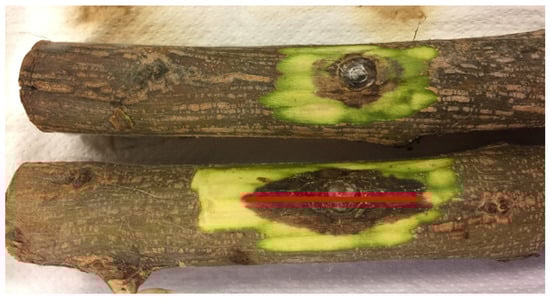 At the end of these tests, the first layers of the bark were removed with a razor blade to show and measure the length of the browned area in the longitudinal direction of the twig (Figure 5).