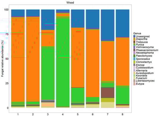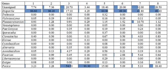Another notable taxon is Punica, which exhibits the highest relative abundance in sample 4 (91.30%) and sample 3 (54.50%), which were asymptomatic sections. In contrast, taxa such as Vishniacozyma, Phaeoacremonium, and Fusarium are present in lower proportions, but show some variability across the samples, with Phaeoacremonium reaching 10.70% in sample 7.