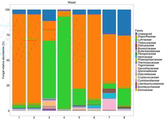 The fungal abundance at the family level in different sections of the tested plants. A description of each sample is provided in Table 1.