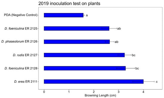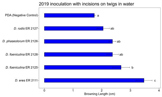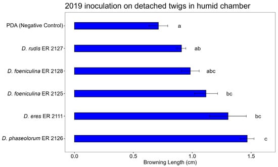 In the 2019 twig inoculation assay with an incision and incubation in water, significant differences in browning length were observed among the Diaporthe species tested, confirmed by Tukey’s HSD test (Figure 11). The control (PDA) exhibited minimal browning, confirming the effectiveness of the wounding method without fungal inoculation. Diaporthe eres (ER 2111) caused the most severe symptoms, producing significantly longer browning compared to all other treatments. Diaporthe foeniculina (ER 2125) also induced substantial browning, although less than D. eres, while D. rudis (ER 2127), D. phaseolorum ER 2126, and D. foeniculina ER 2128 showed intermediate levels of browning, with no significant differences compared to the control.