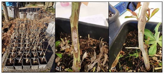 (a) Pomegranate plants immediately after inoculation. (b) A pomegranate trunk with the outer bark layers removed, revealing a browned area at the end of the trial with D. eres. (c) Negative control: a pomegranate trunk with the outer bark layers removed, inoculated with sterile PDA, showing healthy tissues.
