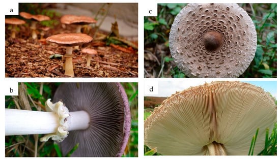 Morphology of S. rugosoannulata (a,b) and M. procera (c,d). (https://ultimate-mushroom.com/edible/224-stropharia-rugosoannulata.html (accessed on 26 November 2024); https://ultimate-mushroom.com/edible/209-macrolepiota-procera.html (accessed on 26 November 2024); Permission to reproduce these images has been obtained).