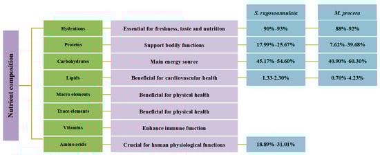 The variety of nutrients makes the edible mushrooms produce a variety of flavors and textures [25]. While S. rugosoannulata and M. procera share many similarities, they also exhibit differences in moisture, protein, carbohydrate (including dietary fiber), and lipid (fatty acid profile) content. Understanding these variations is crucial for optimizing dietary choices and maximizing the nutritional benefits derived from consuming these mushrooms are fundamental to life and must be obtained through dietary intake. S. rugosoannulata and M. procera, recognized for both their edibility and medicinal properties, are rich sources of various nutrients, including proteins, carbohydrates, lipids, minerals, vitamins, and amino acids (Figure 2, Table 1). Additionally, components such as nucleotides, free amino acids, soluble sugars, and organic acids contribute to various flavors and textures [25].