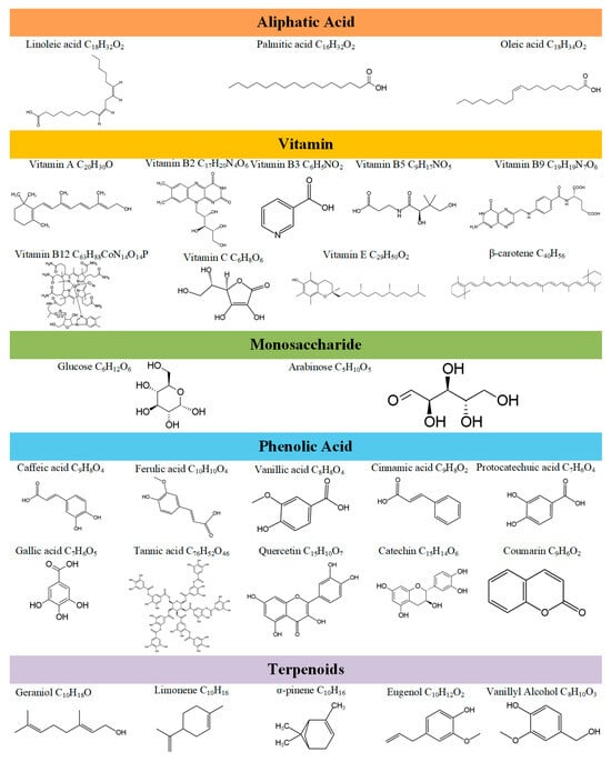 Monoterpenes in M. procera include geraniol and eugenol. Geraniol, present in higher concentrations, exhibits anticancer and antioxidant properties [70]. Eugenol, known for its strong aroma and antimicrobial activity, is widely used in food and pharmaceuticals [71]. Sesquiterpenes in M. procera primarily include α-pinene and β-caryophyllene. α-Pinene has significant antioxidant and anti-inflammatory effects [68], while β-caryophyllene demonstrates anticancer activity, inhibiting the proliferation of certain cancer cells [67]. M. procera is also rich in triterpenes, such as β-sitosterol and lanosterol. β-Sitosterol, present in substantial amounts, exhibits lipid-lowering and anti-inflammatory effects [72]. Lanosterol is recognized for its antioxidant and antitumor activities [73]. Sterols are the primary steroids in M. procera, potentially contributing to cardiovascular health and cholesterol regulation.