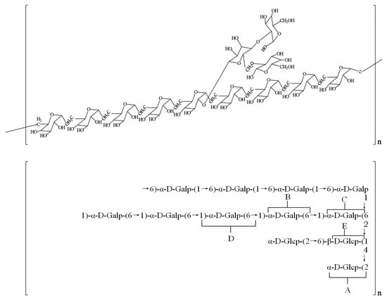 Predicted structure of S. rugosoannulata polysaccharide SR-1 [59]. A: α-D-Glcp(2→(A); B: 6→)-α-D-Galp(1→(B); C: 2, 6→)-α-D-Galp(1→(C); D: 6→)-α-D-Galp(1→(D); E: 4, 6→)-β-D-Glcp(1→(E).