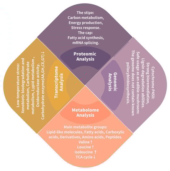 Several “omics” studies have investigated S. rugosoannulata in recent years (Figure 5). Li et al. characterized a monokaryotic S. rugosoannulata strain (A15) and, through proteomic analysis, revealed distinct protein expression profiles between the cap and stipe of S. rugosoannulata fruiting bodies [82]. Proteins associated with carbon metabolism, energy production, and stress response were more abundant in the stipe, while those related to fatty acid synthesis and mRNA splicing showed higher expression in the cap. Hao et al. performed a transcriptomic analysis of S. rugosoannulata under cold stress, identifying 9499 Differentially expressed genes (DEGs) [76]. Gene Ontology (GO) and Kyoto Encyclopedia of Genes and Genomes (KEGG) enrichment analyses indicated that these DEGs were enriched in xenobiotic biodegradation and metabolism, carbohydrate metabolism, lipid metabolism, and oxidoreductase activity. The study concluded that cold stress reduced the expression of carbohydrate-active enzyme genes, such as those encoding auxiliary activities (AAs), glycoside hydrolases (GHs), carbohydrate esterases (CEs), and glycosyltransferases (GTs), leading to decreased cellulase secretion and reduced carbohydrate metabolism and hyphal growth. Another study evaluated the metabolism and activity of S. rugosoannulata protein peptidyl material, identifying the primary metabolites as lipid molecules, fatty acids, carboxylic acids and their derivatives, amino acids, and peptides [83]. KEGG pathway enrichment of differentially expressed metabolites highlighted upregulated pathways like valine, leucine, and isoleucine biosynthesis and downregulated pathways such as the citric acid cycle. Biosynthetic pathways like arginine and proline metabolism were enriched with both upregulated and downregulated differentially expressed metabolites. Wu et al. employed ultra-performance liquid chromatography-tandem mass spectrometry (UPLC-MS/MS) and RNA sequencing (RNA-Seq) for quantitative analysis of flavonoids in S. rugosoannulata [84]. They identified 53 flavonoid-related metabolites and 6726 DEGs. KEGG analysis identified 59 structural genes encoding enzymes involved in flavonoid biosynthesis, most of which were upregulated during fruiting body development, consistent with flavonoid accumulation. This study established a comprehensive transcriptional and metabolic regulatory network of flavonoids, their biosynthetic enzymes, and transcription factors. A high-quality genome assembly of a Chinese S. rugosoannulata cultivar revealed the expansion of genes encoding Manganese peroxidases (MnPs), lignin and xenobiotic degrading enzymes, and cytochrome P450s involved in xenobiotic metabolism, potentially explaining its strong bioremediation and lignin degradation capabilities [85]. The genome lacked genes for known psilocybin biosynthesis, supporting its safe consumption. This genomic analysis is expected to facilitate fruiting body cultivation and provide insights into its bioremediation applications. Finally, Gong et al. investigated the effects of S. rugosoannulata cultivation on woodland soil and bacterial communities [9]. Organic matter content was identified as the primary factor influencing soil bacterial community composition, and spent mushroom compost from S. latifolia cultivation, rich in organic matter and mycelia, was shown to improve soil nutrient content, bacterial community composition, and diversity.