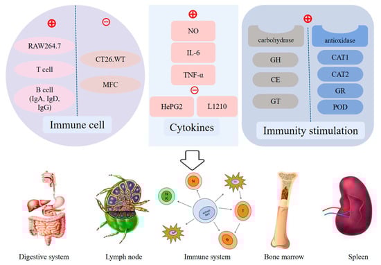 S. rugosoannulata and M. procera, as traditional edible mushrooms, have garnered attention for their potential immunomodulatory effects. Studies suggest that these mushrooms can influence immune cell function, regulate cytokine production, and activate immune-stimulating mechanisms. Immune cells, including T cells, B cells, and macrophages, play central roles in immune responses. S. rugosoannulata polysaccharide SR1 stimulates the growth of T lymphocytes, B lymphocytes, and RAW264.7 cells and enhances IgD and IgG secretion by B lymphocytes [3], thereby enhancing cellular immune responses (Figure 6). M. procera also enhances immune cell function, with its water extract increasing T cell activity and cytokine secretion, demonstrating immunostimulatory effects. Cytokines are crucial signaling molecules in the immune system, regulating immune cell function and immune responses. S. rugosoannulata extracts exhibit positive effects on cytokine regulation, inhibiting the proliferation of HepG2 and L1210 cells potentially enhancing immune responses, and suppressing inflammation [86] (Figure 6). M. procera extracts also demonstrate significant cytokine regulatory effects. Water extracts of M. procera induce NO, IL-6, and TNF-α production in RAW264.7 cells [61], suggesting potential roles in enhancing immune responses and modulating inflammation. The immunostimulatory mechanisms of S. rugosoannulata are primarily attributed to its polysaccharides (Figure 6). Carbohydrate-active enzymes like glycosyl hydrolases (GH), carbohydrate esterases (CE), and glycosyltransferases (GT) contribute to polysaccharide metabolism, while antioxidant enzymes like catalase (CAT1 and CAT2), glutathione reductase (GR), and peroxidase (POD) protect immune cells from oxidative stress [76]. The immunomodulatory effects of M. procera are mediated by polysaccharides and other bioactive components. Studies indicate that M. procera polysaccharides exert strong immunostimulatory effects by regulating cytokines and activating macrophages [87]. Certain components of M. procera can also modulate gut microbiota, promoting the growth of beneficial bacteria and further enhancing host immune function.