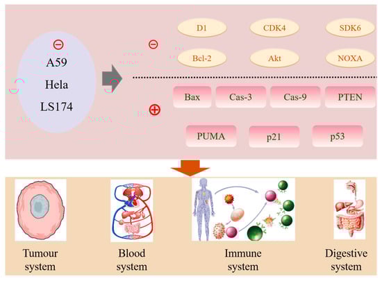 Anticancer mechanism of S. rugosoannulata and M. procera. S. rugosoannulata and M. procer exert their anticancer effects by inhibiting the proliferation of A59, HeLa, and LS174 cells. This is primarily reflected in the suppression of the expression of genes such as D1, CDK4, SDK6, Bcl-2, Akt, and NOXA, while promoting the expression of genes including Bax, Caspase-3/9, PTEN, PUMA, and p21/p53. A59: Human non-small cell lung cancer cells; Hela: Human cervical cancer; LS174: Human colon cancer; D1: Cyclin D1; CDK4: Cyclin-dependent kinase 4; Bcl-2: B-cell lymphoma 2; Akt: Protein kinase B; NOXA: Apoptosis regulator; Bax: Bcl-2-associated X protein; Cas-3/9: Caspase-3/9; PTEN: Phosphatase and tensin homolog; PUMA: p53 upregulated modulator of apoptosis; p21/53: Cyclin-dependent kinase inhibitor p21/53.