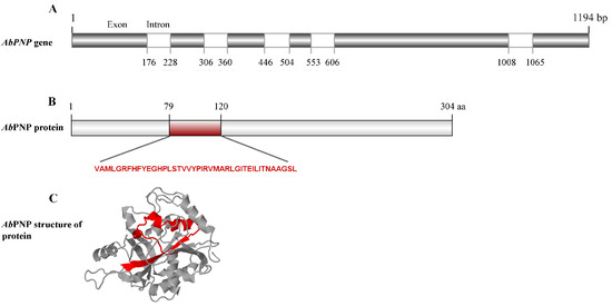 The AbPNP putative gene (Gene ID:18825793) has a sequence length of 1194 bp and contains five introns (Figure 1A) located at 176–228 bp, 306–360 bp, 446–504 bp, 553–606 bp, and 1008–1065 bp, with a coding sequence length of 915 bp; it encodes for AbPNP containing 304 amino acid residues, and its motif is between amino acid residues 79 and 120 (Figure 1B).The AbPNP amino acid sequence was submitted to Expasy and SignalP websites for analysis, and the results showed that AbPNP was expressed intracellularly without a signal peptide, with a molecular weight of approximately 32.52 kDa and a theoretical isoelectric point pI of 5.85.