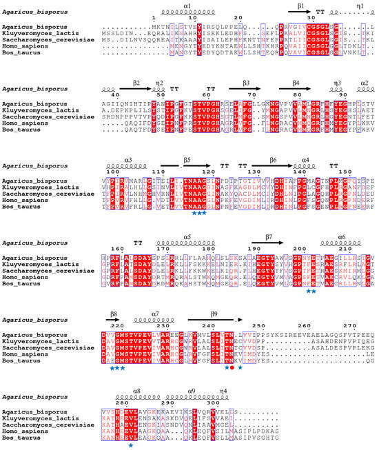 Amino acid sequence alignment of PNP using ESPript server. Highly conservative regions are highlighted with red boxes and conservative substitutions are shown with boxes. Active site residues involved in hypoxanthine action are shown with asterisks, and catalytically active residues known to play an important role in substrate specificity are shown with red-filled circles.