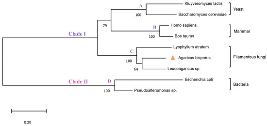 The calf PNP’s experimentally dissolved X-ray structure (PDB ID: 3FUC) was employed as the template as it shares 43.5% sequence identity with AbPNP and significantly matches the region near the active site (Figure 2). The AbPNP’s phosphate-binding site primarily contained G30, S31, H62, R84, H86, N115, A116, and S221, and the purine nucleoside binding sites were S31, H86, Y88, A116, A117, G118, Y201, E202, V218, G219, M220, T243, N244, H278, and V281. The eight PNP protein sequences were analyzed for homology using the neighbor-joining method for homology analysis and construction of a phylogenetic tree (Figure 3). Eukaryotic and prokaryotic PNPs were clustered into two clades, I and II, respectively. Clade I included yeast, mammals, and filamentous fungi, in which AbPNPs were clustered into a group of filamentous fungi; Clade II included bacteria. The above sequence analyses and structure predictions confirmed the putative gene PNP from A. bisporus as a purine nucleoside phosphorylase gene.