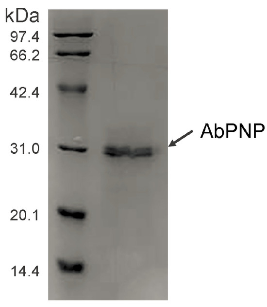 The codon-optimized AbPNP gene was successfully expressed in P. pastoris. SDS-PAGE indicated a specific band of about 32.5 kDa in the purified sample (Figure 4), which corresponds well to AbPNP’s molecular weight assessed via gene sequence. Furthermore, AbPNP’s molecular mass was consistent with that reported previously, such as Bos taurus PNP (31.6 kDa) [19], K. lactis PNP (33.4 kDa) [13], Saccharomyces cerevisiae PNP (33.7 kDa), Homo sapiens PNP (32.1 kDa), Lyophyllum atratum PNP (33.6 kDa), and Leucoagaricus sp. PNP (32.6 kDa). These data indicated that the AbPNP protein was successfully expressed in P. pastoris and secreted into the culture.