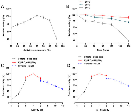 Enzymatic properties of recombinant AbPNP. (A) optimum temperature; (B) temperature stability; (C) optimum pH; (D) pH stability.