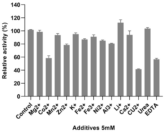 These thermal properties of AbPNP also make it suitable for potential applications in the beverage industry. At 5 mM metal ion and chemical reagent concentration (Figure 6), Co2+, Cu2+, and EDTA had a significant inhibitory effect on AbPNP, with residual activities of 58.50 ± 4.95%, 41.50 ± 0.71%, and 56.50 ± 1.21%, respectively. Furthermore, Zn2+ and Al3+ indicated some inhibitory effect, with 78.50 ± 2.12% and 80.50 ± 0.71% residual activities, respectively. Li+ showed a promoting effect on the AbPNP activity (112.50 ± 6.36%), whereas other metal ions and urea indicated minimal effect. Li et al. [24] showed that in the wort, metal ions were mainly acquired from water and malt, including Mg2+ (3.5–4.0 mmol/L), Na+ (0.9–2.0 mmol/L), Fe3+ (0.003–0.005 mmol/L), and Ca2+ (0.75–1.0 mmol/L). The present study found no effect of these metal ions on AbPNP. Zn2+ is a crucial factor for yeast growth; it is usually added before the inoculation of brewer’s yeast and is not affected by AbPNP when applied to wort saccharification. These results indicate that the AbPNP is highly resistant to most metal ions.