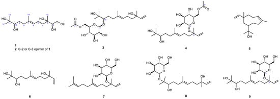 By comparing the NMR spectroscopic data with the data in the literature [,,], the five known compounds (5–9) were identified as neroplomacrol (5), 3,7,11-trimethyl-1,6-dodecadien-3,10,11-triol (6), mannonerolidol (7), icariside C2 (8), and icariside C3 (9).