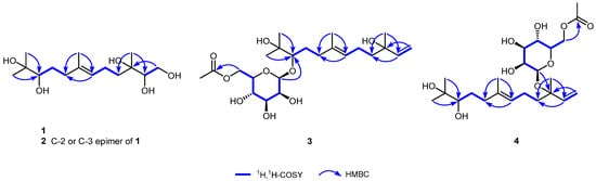 The 1H,1H-COSY and significant HMBC correlations of compounds 1–4.