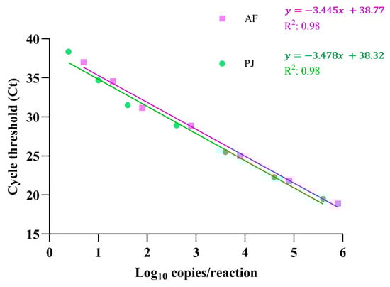 Linear regression analysis of the Ct values across the dilution series demonstrated a strong correlation with the expected DNA concentrations, with R² values of 0.98 for both AF and PJ (Figure 1). The calculated PCR efficiency was 95.1% for AF and 93.9% for PJ, confirming the robustness of the assay under optimized conditions.