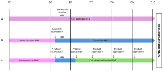 The study was conducted on the following six arms in biological quadruplicate (except for the non-colonized RHE arm, which was in biological triplicate): (1) Non-Colonized (NC): sterile RHE tissue covered with a bovine nail with no product application, used as a negative control; (2) Colonized with no application (CNA): RHE colonized with T. rubrum covered with a bovine nail with no product application; (3) C/UDN: RHE colonized with T. rubrum covered with a bovine nail with one daily application of Urgo Damaged Nails; (4) C/PdermP: RHE colonized with T. rubrum covered with a bovine nail with one daily application of the natural oil-based Poderm Purifying; (5) C/PdermP + PdermB: RHE colonized with T. rubrum covered with a bovine nail with one daily application of Poderm Purifying + Poderm Booster; (6) C/EXlor: RHE colonized with T. rubrum covered with a bovine nail with one daily application of Excilor Forté. The Excilor product is the positive control as a similar effect of daily Excilor® applications compared to once weekly amorolfine application was shown in vitro [13]. Additionally, clinically proven efficacy is being evaluated in subjects with onychomycosis [14]. All tested products are commercial products aiming at strengthening and restoring the nail structure damaged by onychomycosis. All products are classified as medical devices. The various steps in the set-up of the 3D model are summarized in Figure 1 and are detailed below.
