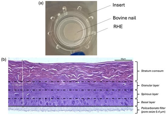 Figure 2. (a) Representation of the 3D model of SkinEthicTM Reconstructed Human Epidermis (RHE) covered by a bovine nail sheet, (b) Histological observation of the non-colonized RHE.