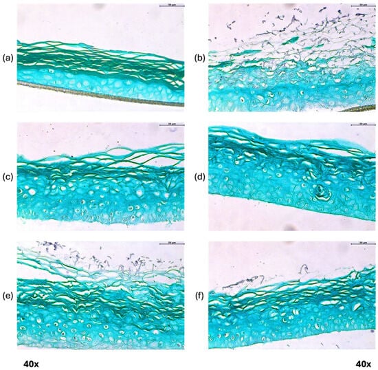 Microscope acquisitions of non-colonized and colonized RHE tissues were obtained for the different experimental arms (Figure 3). No staining was observed in the acquisition of the NC (Figure 3a), while a massive staining was observed in the acquisition of CNA (Figure 3b), confirming the presence of T. rubrum in the model. Fungi were visually less present on the colonized-RHE with one daily UDN application on the bovine nail (Figure 3c) and on the colonized-RHE with one daily EXlor application on the bovine nail (Figure 3d) as compared to CNA. In contrast, fungi were visualized on the colonized RHE with one daily PDermP application on the bovine nail (Figure 3e) and on the colonized RHE with one daily PdermP + PdermB application on the bovine nail (Figure 3f).