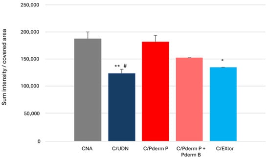 Microscope acquisitions were processed using LASX software, converting the black staining into a measurable signal intensity that quantified the presence of T. rubrum. Sum intensities per covered area by the fungus stained across the different experimental arms after 4 days of applications are provided in Figure 4. The highest values of sum intensity/covered area were observed for the colonized RHE with no application (CNA). Compared to CNA, sum intensities were statistically significantly lower in C/UDN (−34%, p < 0.001) andC/EXlor (−28%, p < 0.020). No statistically significant difference was observed in C/PdermP (−2%) and C/PdermP + PdermB vs. CNA.