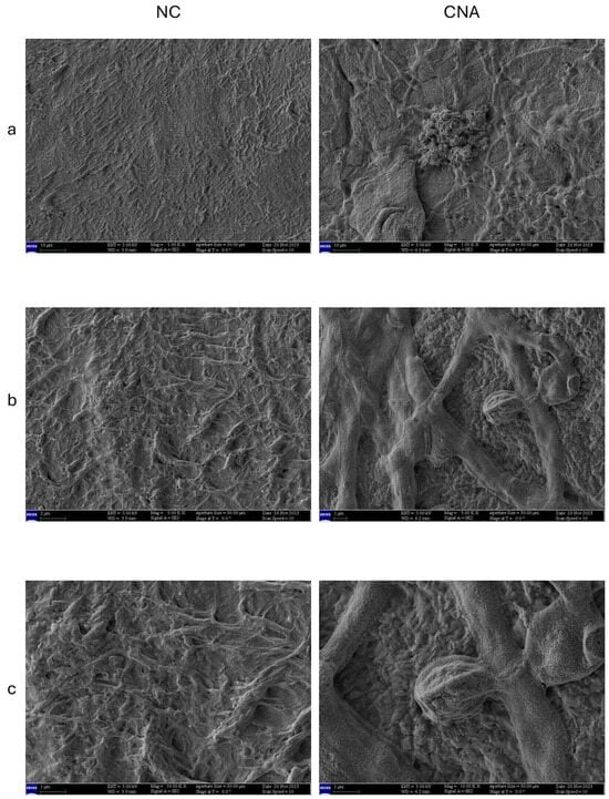 Figure 5. SEM acquisition of GMS stained RHE covered with the bovine nail. Left panel: Non-colonized RHE (NC); Right panel: Colonized RHE with no product application (CNA). Acquisitions were obtained at several magnifications: (a) at 1000×, (b) at 5000×, and (c) at 10,000×. In (b,c) CNA panels, an amorphous agglomerate is visible, which may be attributable to the presence of fungal spores.