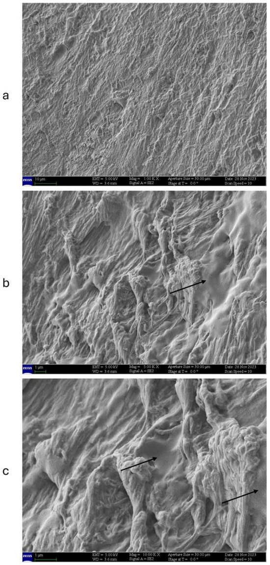 Figure 6. SEM acquisition showing the growth of the hyphal network that is covered with the bovine nail receiving one daily application of UDN. Acquisitions were obtained at several magnifications: (a) at 1000×, (b) at 5000×, and (c) at 10,000×. Traces of applied products on RHE surface are visible (black arrows).